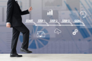ステップに沿ってスタートからゴールを目指すビジネスマンのイメージ画像