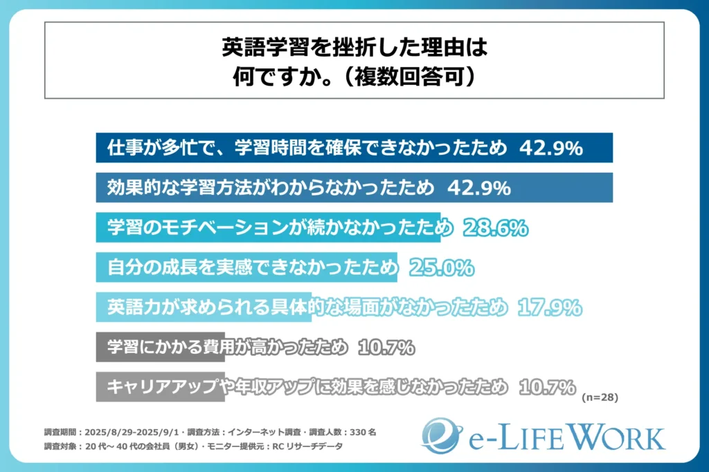 次に、過去にキャリアや年収アップを目的の一つとして英語を学習していたが、挫折したと回答した人を対象に「英語学習を挫折した理由」を尋ねる設問への回答では、1位が同率で「仕事が多忙で、学習時間を確保できなかったため」と「効果的な学習方法がわからなかったため」で42.9%、2位が「学習のモチベーションが続かなかったため」で28.6%という結果になりました。この結果から、過去にキャリアや年収アップを目的の一つとして英語学習をしていたが、挫折した人の理由は、学習者自身の問題が上位の回答に並ぶ形になりました。