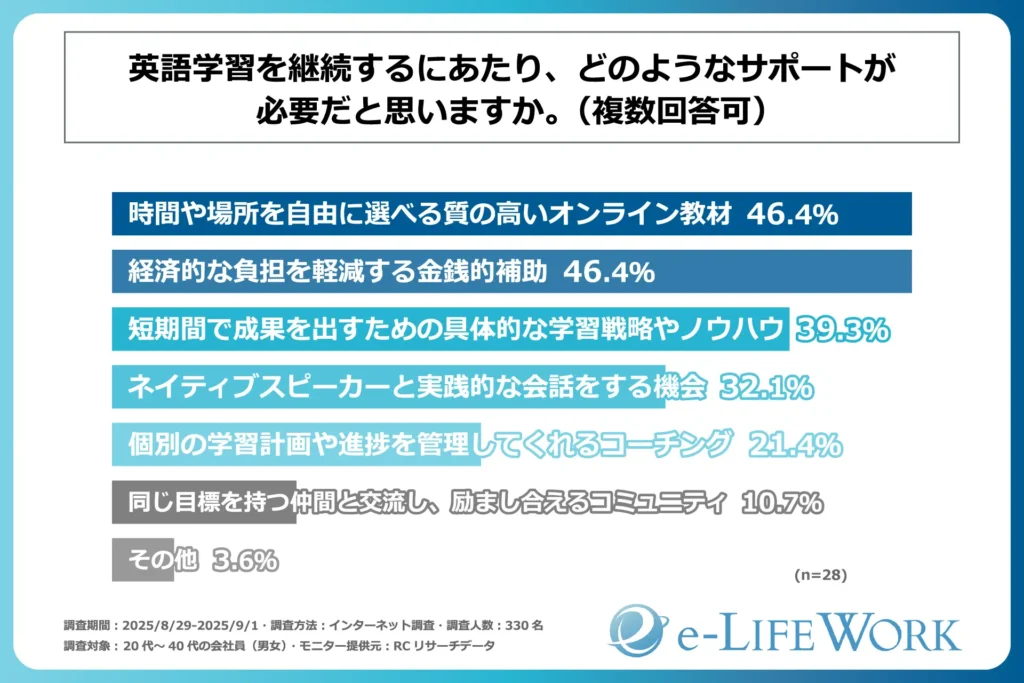 過去にキャリアや年収アップを目的の一つとして英語学習をしていたが、挫折した人が、英語学習を継続するにあたり、必要だと思う主なサポートは「時間や場所を自由に選べる質の高いオンライン教材」と「経済的な負担を軽減する金銭的補助」